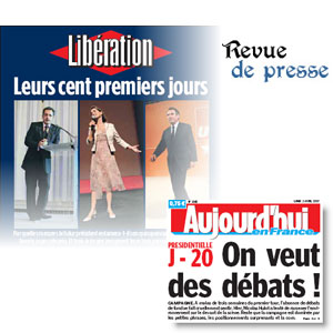 Ce matin, les Unes de la presse résument bien la campagne électorale : Libération présente le programme des trois candidats qui ont monopolisé l'attention des médias, c'est-à-dire Nicolas Sarkozy, Ségolène Royal et François Bayrou et Le Parisien/Aujourd'hui en France réclame des débats entre les candidats. Alors qu'il y a 12 candidats, seuls 3 ont pu réellement exposer leurs idées dans les médias et aucun débat n'a eu lieu entre eux.
