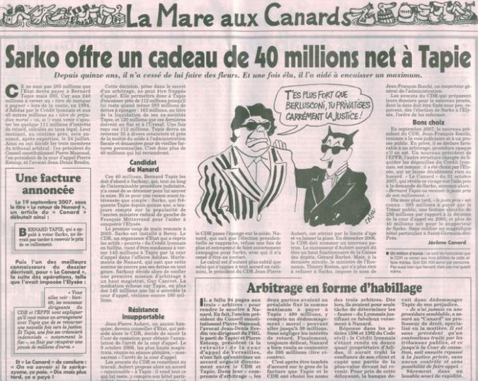 Dans cette affaire, le Crédit Lyonnais a fait preuve de légèreté dans le meilleur des cas, et a plus certainement voulu rouler Bernard Tapie. Un jugement en appel avait accordé près de 135 millions d'euros à Bernard Tapie (le jugement avait été cassé ensuite au profit du Crédit Lyonnais). Mais en passant par un accord à l'amiable, l'Etat fait fort : il triple la mise pour Bernard Tapie (395 millions d'euros). Ce petit coup de pouce viendrait directement de l'Elysée. Nicolas Sarkozy et Bernard Tapie se connaissent depuis plus de 15 ans. A chaque fois que Nicolas Sarkozy a été en mesure de d'aider l'ancien ministre de Mitterrand, il l'a fait. Durant la présidentielle, Bernard Tapie s'est donc rallié, en toute amitié, au candidat de l'UMP en martelant dans les médias que Ségolène Royal n'avait pas la carrure pour être présidente. En retour, Nicolas Sarkozy a créé les conditions juridiques et politiques pour que le conflit Tapie/Crédit Lyonnais penche en faveur de Bernard Tapie. Et selon le Canard Enchaîné, un retour en politique de Bernard Tapie, aux Européennes de 2009 par exemple, pour gêner le Parti Socialiste, n'est plus à exclure...