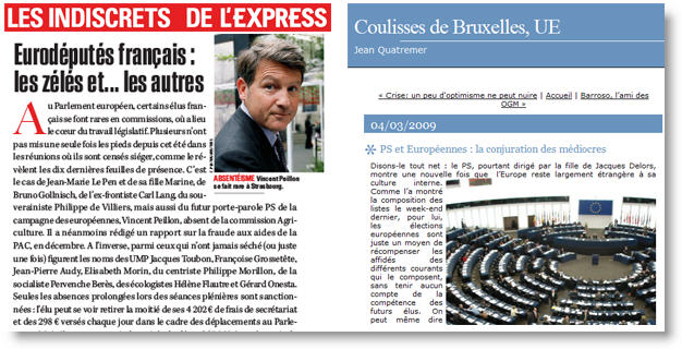 De son côté, l'Express critique de manière plus implicite. Dans son édition du 05 mars, l'hebdomadaire rappelle l'absentéisme chronique des eurodéputés français en listant tous ceux qui n'ont pas assisté aux réunions de leur commission depuis l'été dernier, selon les feuilles d'émargement. L'Express cite notamment la plupart des responsables politiques d'extrême-droite : Jean-Marie Le Pen, Marine Le Pen, Bruno Gollnisch, le souverainiste Philippe de Villiers. Un seul responsable de gauche est cité dans la brève : Vincent Peillon. Futur porte-parole PS de la campagne des Européennes, ce proche de Ségolène Royal est absent de la commission Agriculture depuis six mois. "Il a néanmoins rédigé un rapport sur la fraude aux aides de la PAC, en décembre" tient tout de même à préciser l'hebdomadaire. Malgré tout, pour illustrer cet "indiscret", l'Express a choisi de publier une photographie du député sortant.