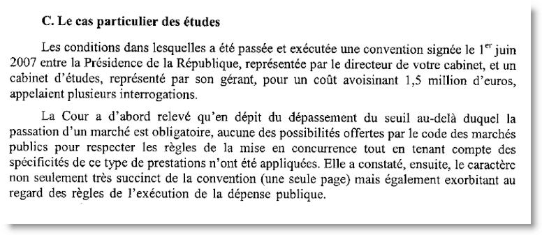 Le cabinet d'études choisi par l'Elysée a entièrement géré les commandes de sondages. La Cour des comptes déplore l'absence de contrôle de la part de l'Elysée : "La Présidence n'avait ni la maîtrise, ni le contrôle tant de l'engagement que du montant des dépenses. Aucun bon de commande n'était émis. La Présidence recevait l'étude accompagnée d'une facture indiquant le titre du sondage et sa date de réalisation, sans aucun autre élément permettant d'attester de la réalité du service fait et de son coût réel". Le signalement a été jugé suffisamment sérieux par l'Elysée puisque le contrat a été modifié en mars 2009. En outre, Philippe Séguin explique dans sa lettre que certaines enquêtes se sont retrouvées dans la presse.