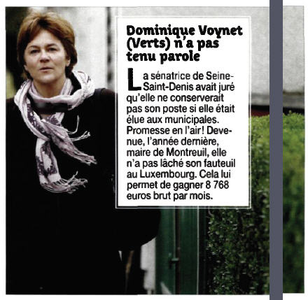 Avec 54.2% des voix contre 45.8% pour la liste du maire sortant Jean-Pierre Brard, Dominique Voynet est élue maire de Montreuil en mars 2008. Alors qu'elle s'était engagée être "un maire à temps plein" pendant la campagne électorale, laissant entendre qu'elle démissionnerait de son poste de sénatrice, Dominique Voynet a décidé de cumuler. Officiellement pour éviter de faire perdre aux Verts l'un des 5 postes de sénateur. On peut également ajouter que ce n'est pas une mauvaise opération financière. En plus de son salaire de sénatrice, Dominique Voynet touche 1 760 euros brut en tant que maire de Montreuil. Au total, ses revenus s'élèvent donc à 8 768 euros brut par mois. Et encore, elle aurait pu gagner plus...