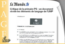 Source : "Critique de la primaire PS : un document révèle les éléments de langage de l'UMP", Lemonde.fr, 9 octobre 2011