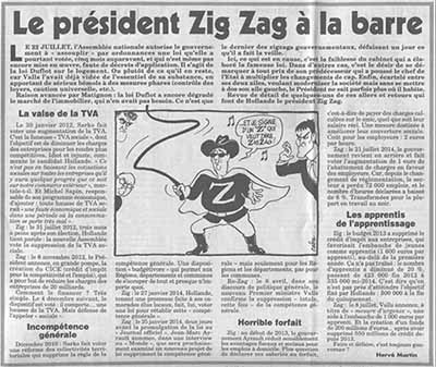 - Hervé Martin, "Le président Zig Zag à la barre", Le Canard enchaîné n°4892, 30.07.2014