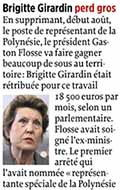 En réalité, Le Point assure aujourd'hui qu'"en supprimant le poste de représentant de la Polynésie française, le président Gaston Flosse va faire gagner beaucoup de sous au territoire". Selon un parlementaire, "Brigitte Girardin était rétribuée pour ce travail 18 500 euros par mois". Plus que le Président de la République ? Il y a un an, lorsque ce poste avait été créé, des élus de l'assemblée territoriale de Polynésie avaient dénoncé le coût de cette fonction : "C'est l'histoire d'une convention de prestation de services à 2,3 millions de francs pacifiques [soit environ 18 000 euros], plus 10 aller et retours annuels en business class, plus véhicule de fonction qui a choqué même les plus blasés des fonctionnaires du Pays. Une histoire triste et insultante pour notre Peuple", avait déclaré l'un d'entre eux.